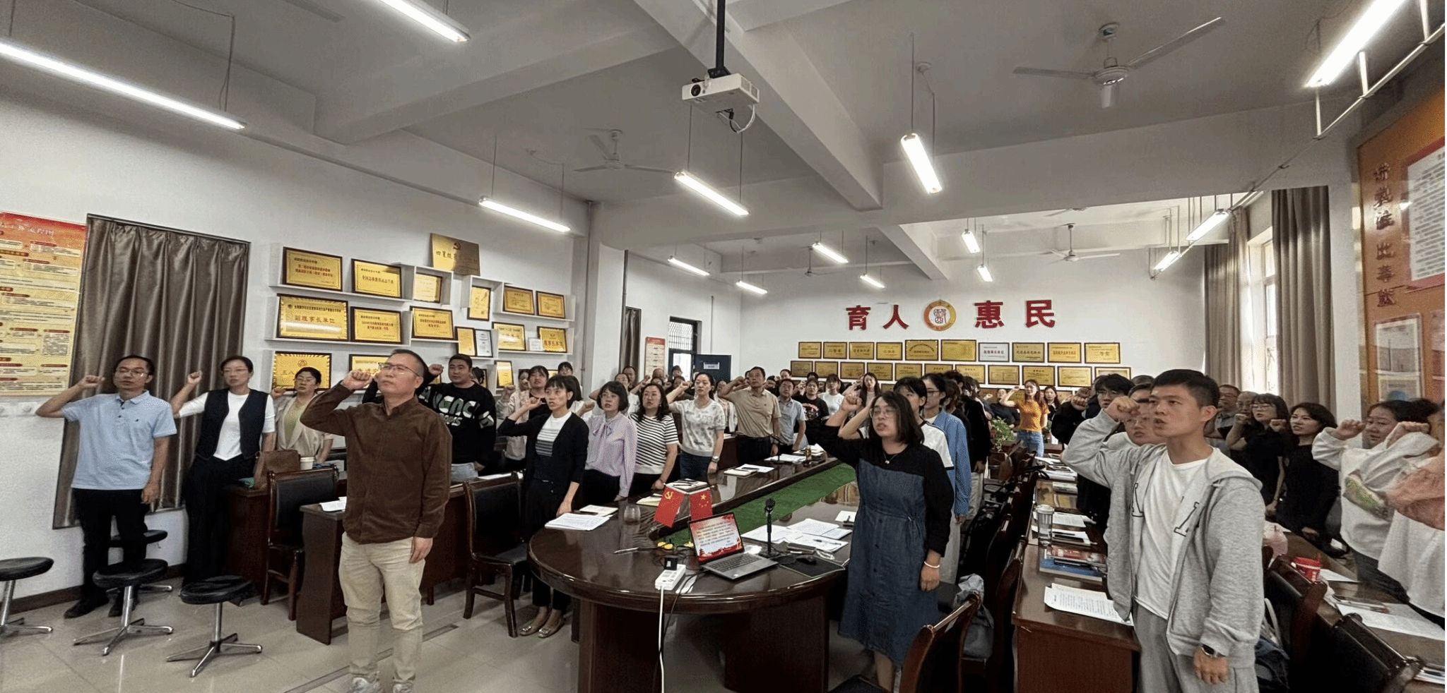 专题学习后举行了庄严的教师宣誓仪式。在王萌老师的带领下,全体教师右手举拳,庄严宣誓,表达了全体教师恪守师德、坚守初心、为党育人、为国育才的坚定决心。
